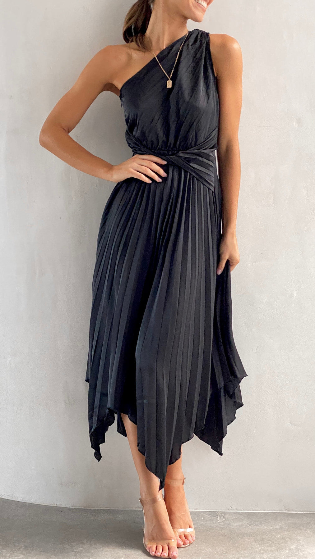 The Cali One Shoulder Midi Dress in Black is your go-to for standout moments this season. With a sleek one-shoulder cut, flattering twist detail at the waist, and an elegant pleated skirt that falls in an asymmetrical hem, this piece was designed to turn heads. Whether you’re heading to a party or dressed up for a wedding, this midi brings effortless sophistication.