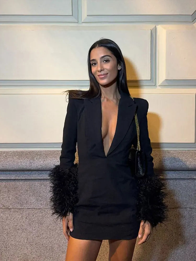 The Sallie Sophisticated Blazer Dress redefines formalwear with its bold design and playful details. Featuring feather accents and a double-breasted silhouette, this dress blends classic tailoring with modern flair. Crafted from plush velvet with satin lapels, it’s the perfect choice for those who want to stand out at any event.