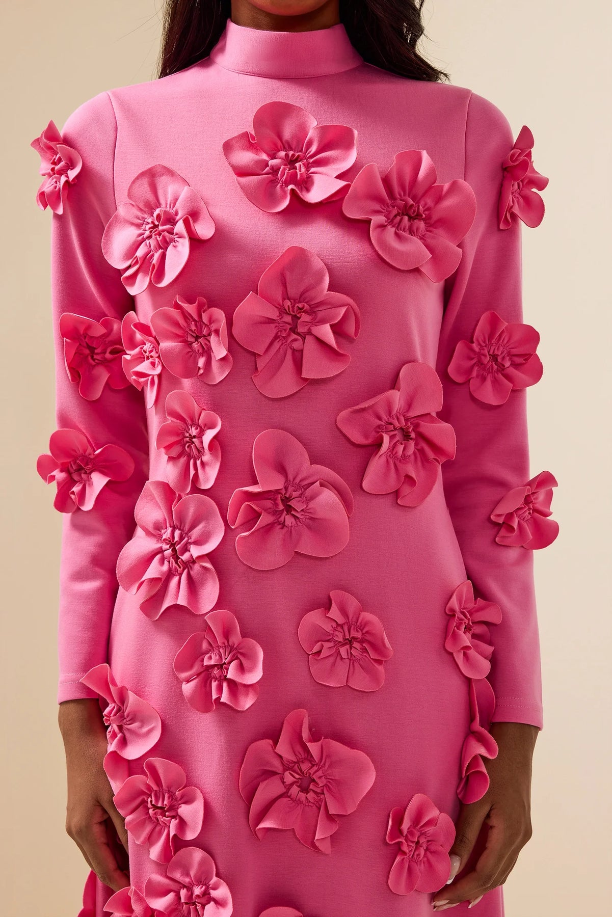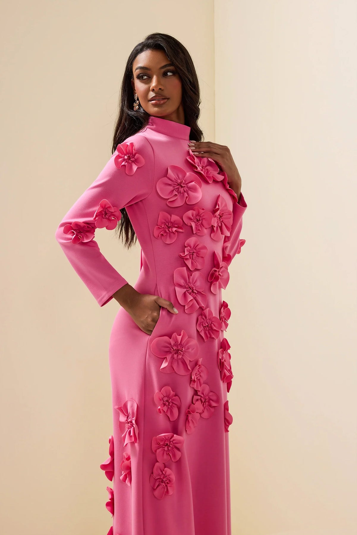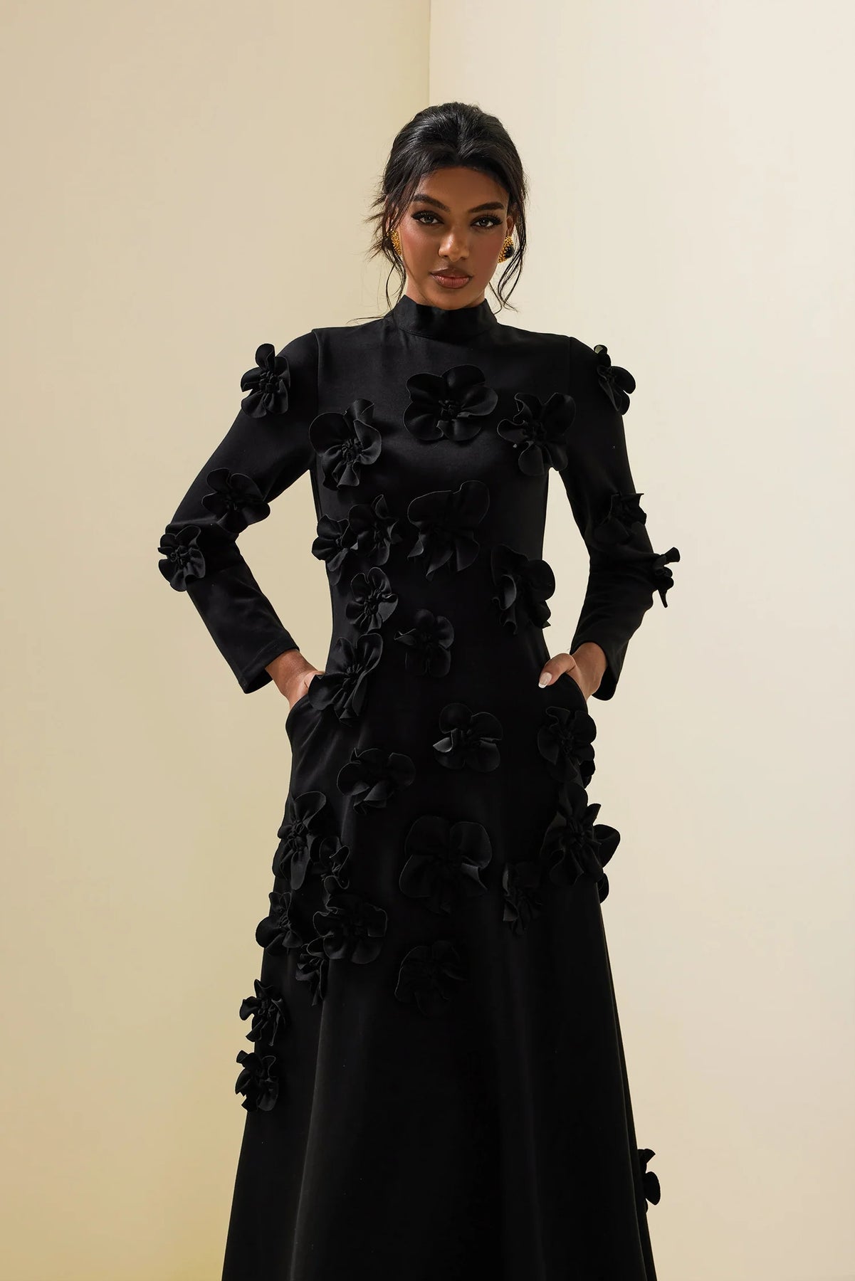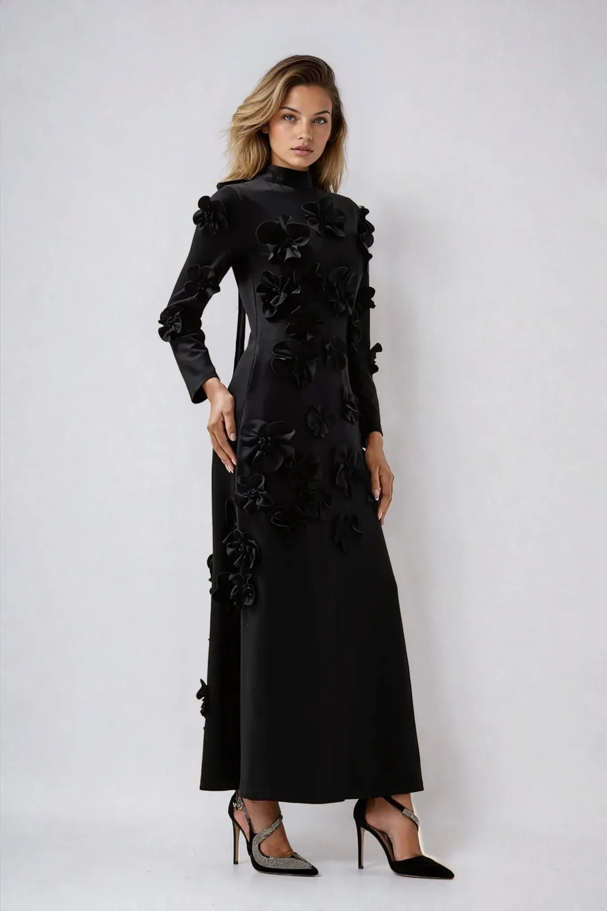 Command attention with the Adelle Maxi Dress, a masterpiece of modern elegance and refined artistry. Designed with a graceful high neckline and long sleeves, this dress features intricate 3D floral appliqués that add captivating texture and dimension. Its structured silhouette flows effortlessly into a sophisticated midi length, creating a look that is both powerful and feminine. Perfect for evening affairs and special occasions, the Adelle Midi Dress exudes confidence, grace, and timeless allure.