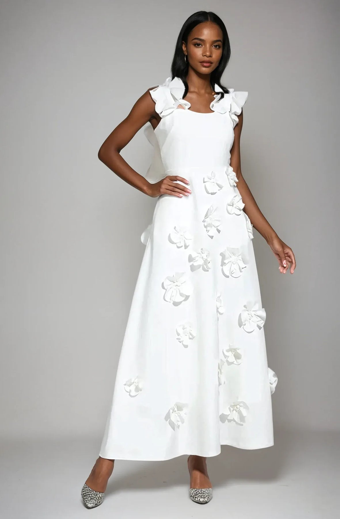 The Gwen Maxi Dress is the epitome of modern romance and effortless sophistication. Designed with a flattering, structured bodice and a flowing A-line silhouette, this dress moves with grace and confidence. Its delicate 3D floral embellishments add a touch of artistic charm, creating a look that’s both timeless and captivating. The ruffled shoulder accents bring a playful yet refined detail, making it perfect for weddings, elegant soirées, or any occasion where you want to make a lasting impression. Step into the Gwen Maxi Dress and exude elegance with every step.