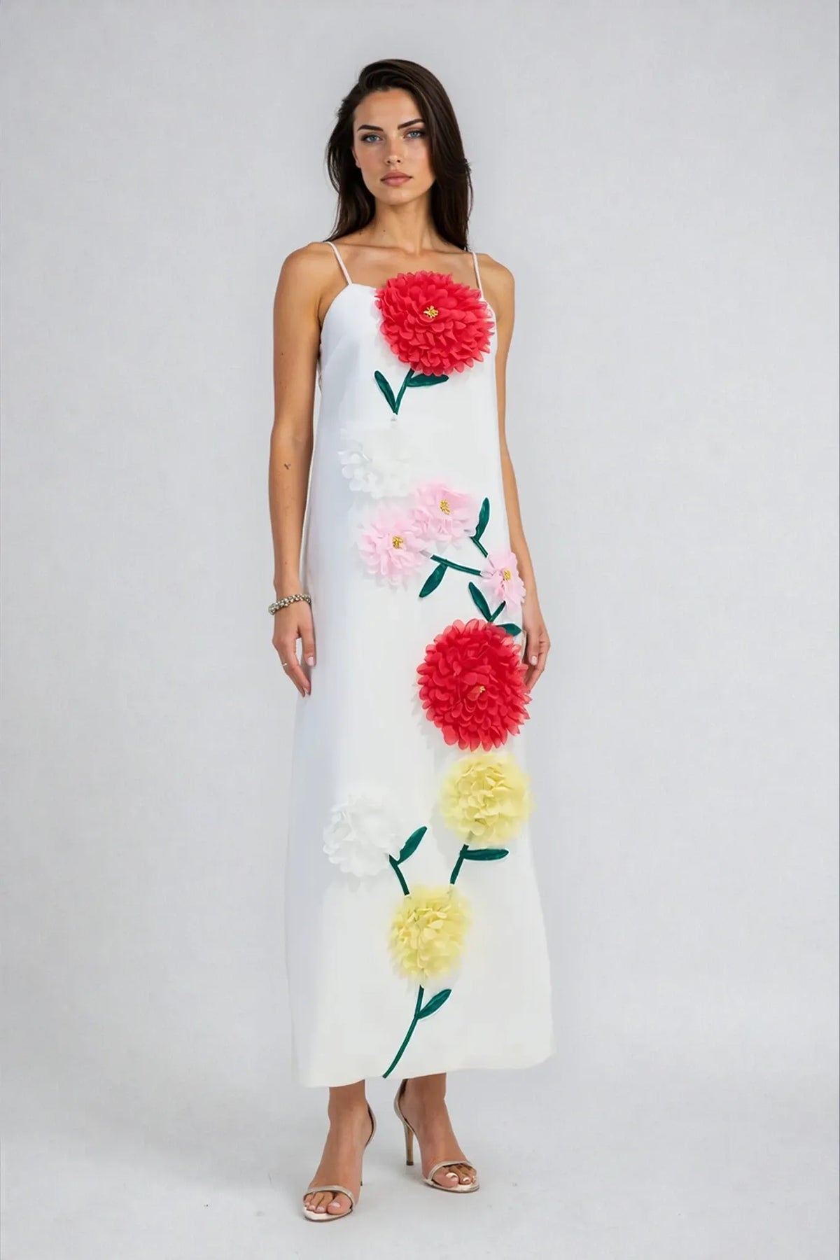 Radiate charm and elegance in the Joelle Maxi Dress, a captivating piece that celebrates modern femininity. Designed with delicate straps and a sleek, elongated silhouette, this dress features exquisite 3D floral embellishments in soft pastel tones that add a romantic, artistic touch. Its graceful flow and refined details create a look that feels fresh, confident, and effortlessly sophisticated—perfect for garden parties, elegant gatherings, and special occasions where you want to make a lasting impression.