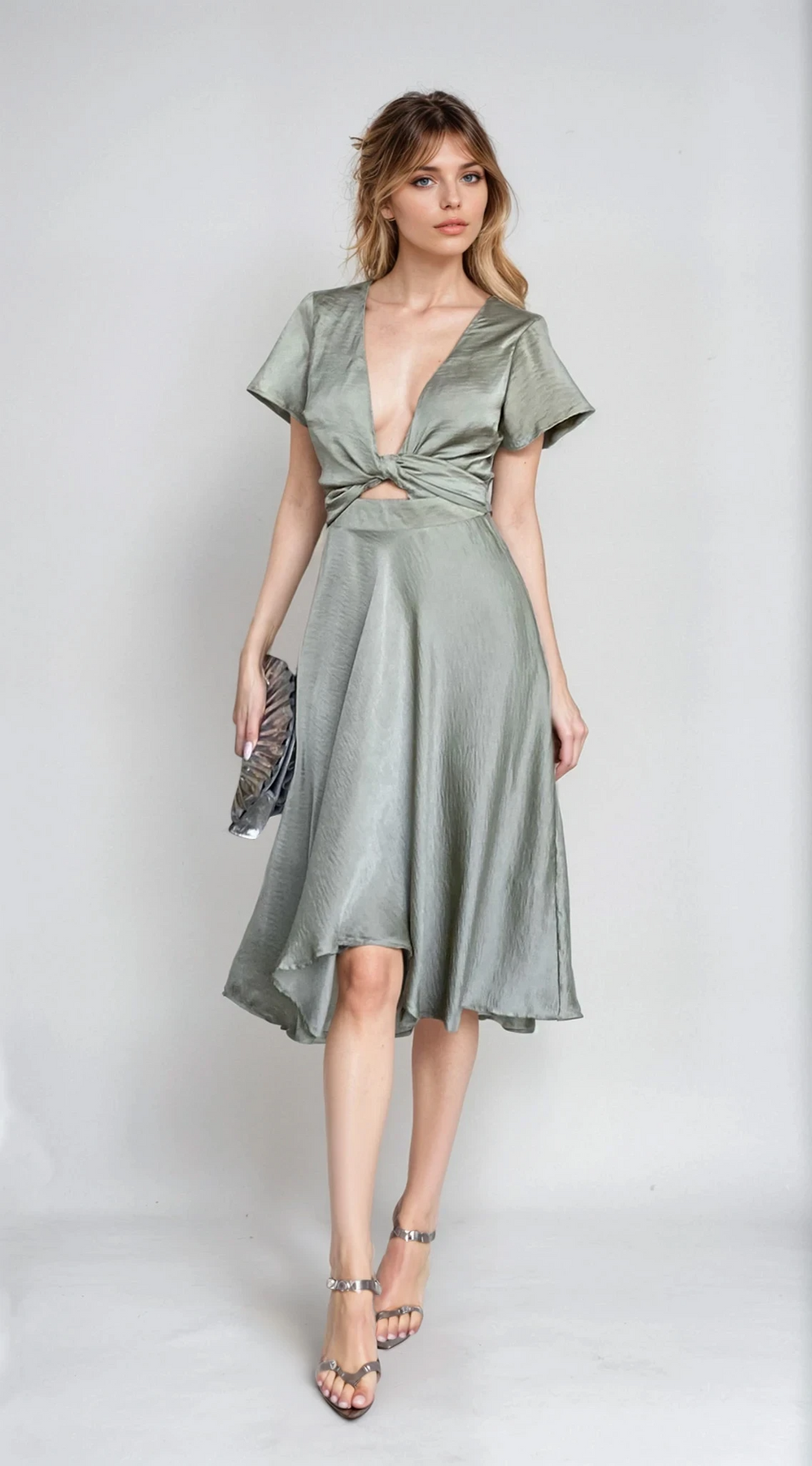 The Sunny Daze Dress in Olive brings effortless elegance to every event. With its satin-feel fabric, fluttering butterfly sleeves, and high-low hemline, this dress flows beautifully while highlighting the waist with a flattering tie detail. Whether wrapped around or tied at the front, it’s a versatile piece made to shine at weddings, parties, and everything in between.