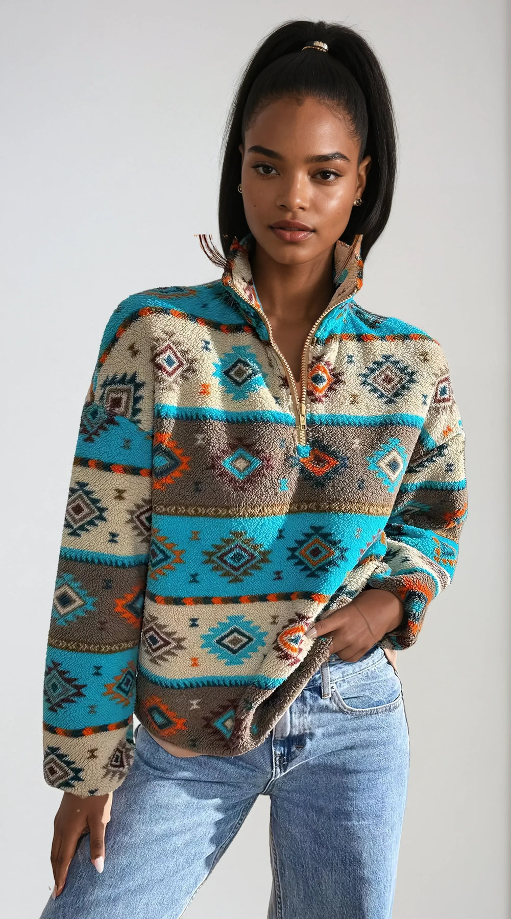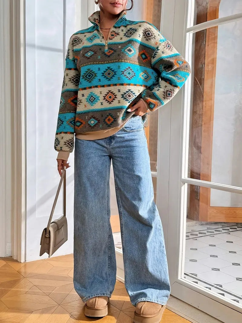 Make a bold statement with the Azara Pullover Fleece Jacket, where cozy comfort meets vibrant personality. Featuring a rich Southwestern-inspired pattern in earthy tones and striking turquoise accents, this piece adds a touch of artistry to your cold-weather wardrobe. Designed with a relaxed fit and a half-zip neckline, it offers just the right blend of warmth and breathability for everyday wear. The eye-catching design brings effortless flair to any outfit, whether paired with denim or layered over basics. From weekend adventures to casual days out, the Azara keeps you feeling warm, confident, and unapologetically unique.